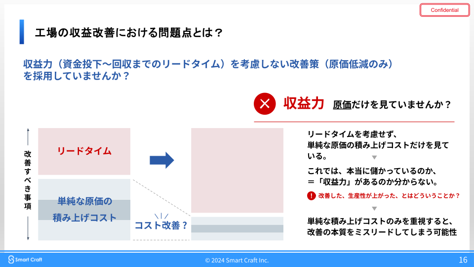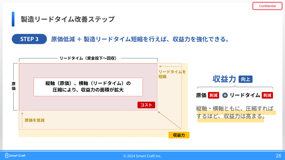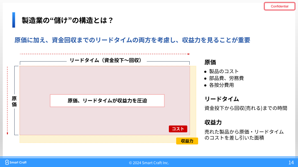 ここで、視点を変えてみましょう。「利益を生む力(収益力)」とは、「原価(縦軸)」と「リードタイム(横軸)」で構成される面積で捉えることができます。