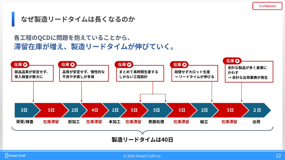 このように、個別の工程で発生した小さなQCDの問題が、まるで川の流れを堰き止めるように各所で「滞留在庫」を生み出し、結果として製造リードタイム全体を大幅に長期化させているのです。