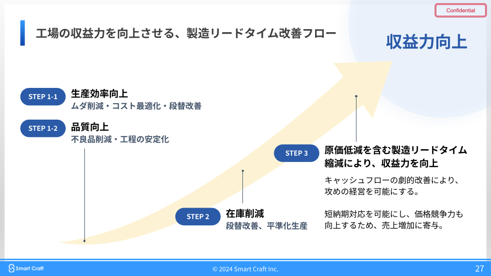 こうしたツールを活用して現状を正しく把握した上で、以下の3ステップに取り組むことが、「利益を生む工場」への最短ルートとなります。