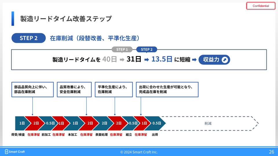 工程の安定化(ステップ1)は品質向上によるムダの削減に繋がり、在庫削減(ステップ2)は管理コストの低減とキャッシュフローの改善に繋がります。これは、前述した「原価(縦軸)」と「リードタイム(横軸)」の両方を同時に圧縮していることに他なりません。